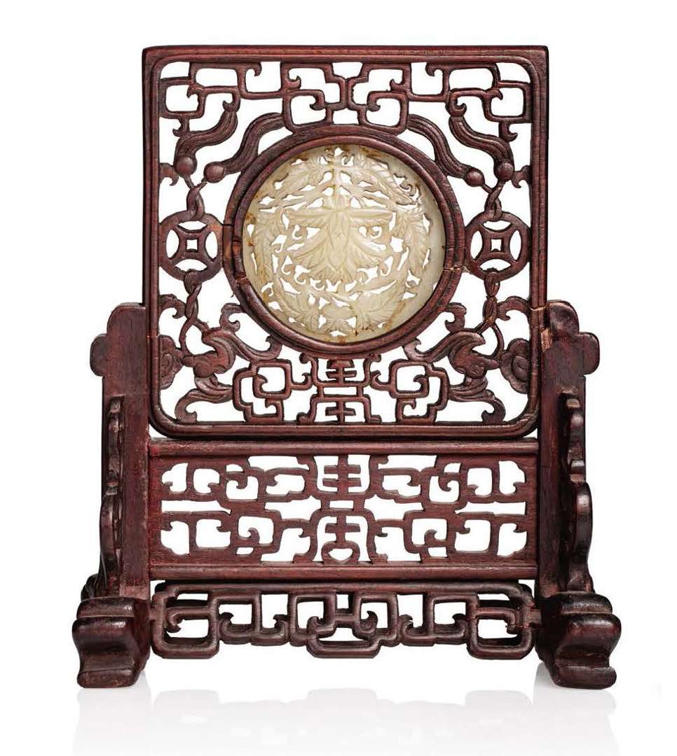 Écran de table, orné d'une plaque circulaire en jade sculptée et ajourée en forme de fleurs de lotus et rinceaux feuillagés, l'écran en bois sculpté à décor du caractère fu et grecques stylisées.