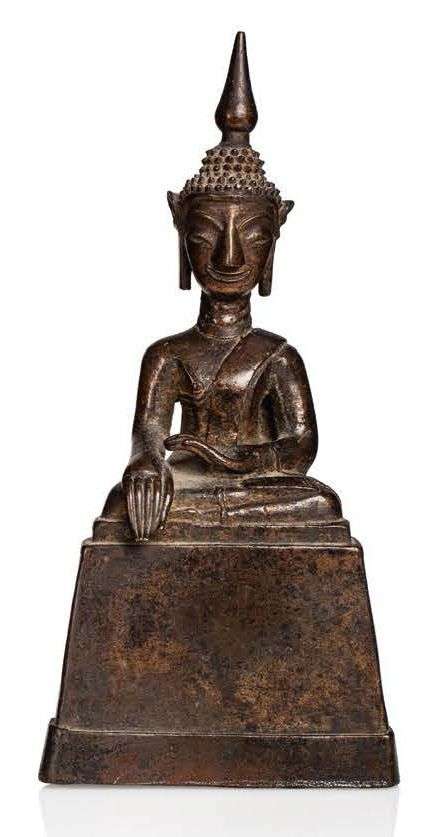 Statuette en bronze, représentant le Bouddha assis en médiation, la main droite en prise de la terre à témoin (bhumisparsa mudra).