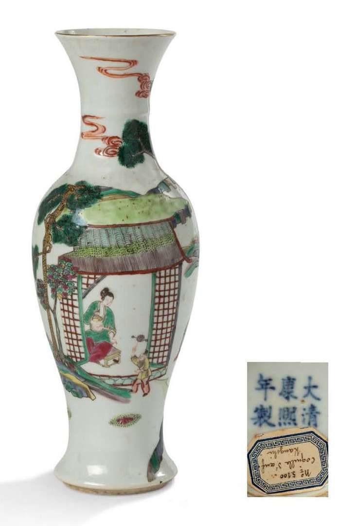 Vase balustre en porcelaine et émaux dans le gout des familles roses, à décor d'un pavillon où se trouve une jeune femme et ses enfants, aux abords d'un champ où des paysans pratique le ramassage du thé.