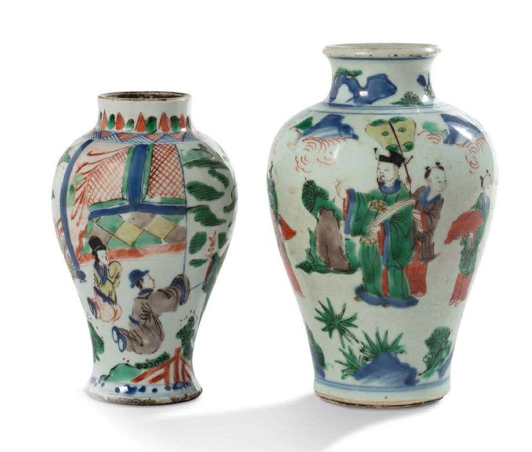 On y joint une petite potiche (Chine, XVIIe siècle) en porcelaine et émaux wucai, à décor de scènes de palais.