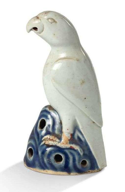 Sujet en biscuit émaillé céladon et bleu, représentant une perruche sur un rocher ajouré émaillé bleu.