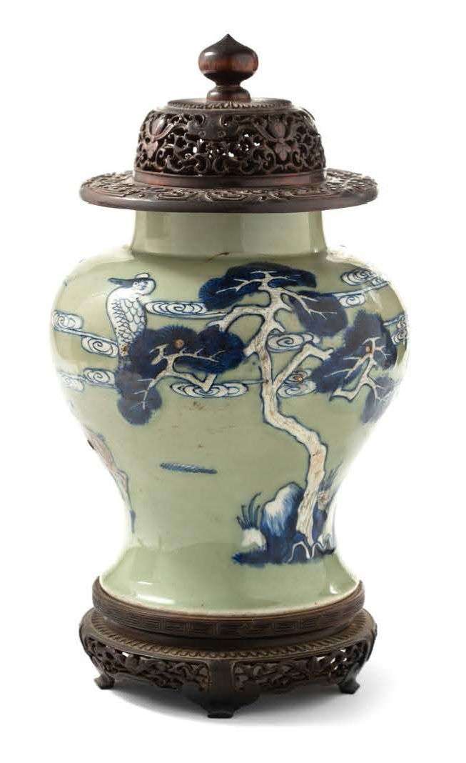 Potiche balustre en porcelaine émaillée céladon, à décor en bleu de cobalt et rouge de cuivre, d'échassiers et d'un couple de daims sous des pins de longévité, le pourtour orné de nuages stylisés.