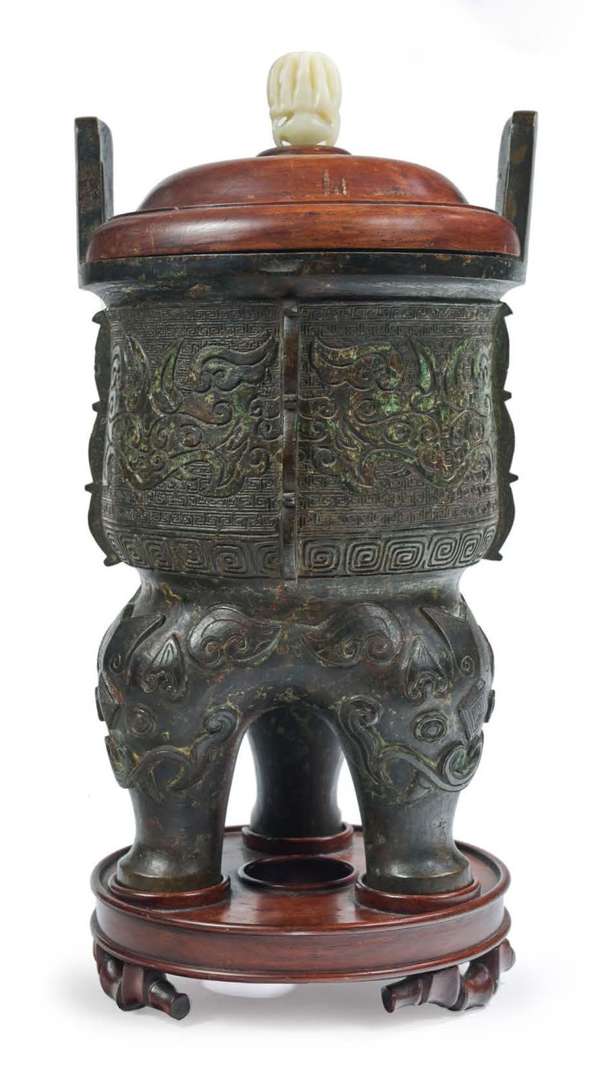 Brûle-parfum en bronze de type Yan reposant sur trois pieds crachés par des têtes de lions à décor archaïsant de masques de taotie, avec couvercle rapporté en bois et prise en jade néphrite amovible reprenant la forme d'un citron digité (main de Bouddha).