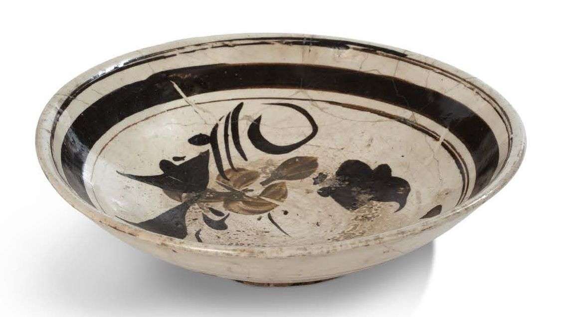 Coupe en céramique de type Cizhou, émaillée beige à décor en brun de plantes aquatiques.