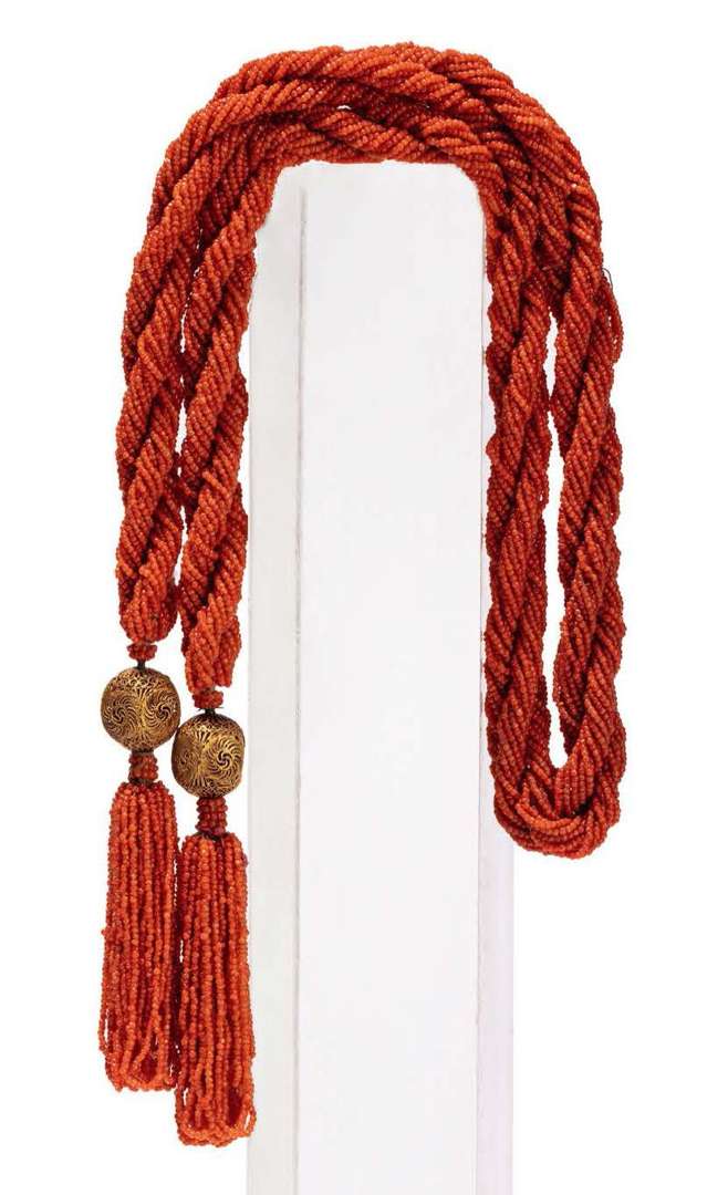 Élément de vêtement tressé de perles de corail, les deux extrémités tenues par deux petites boules de vermeil filigranées.