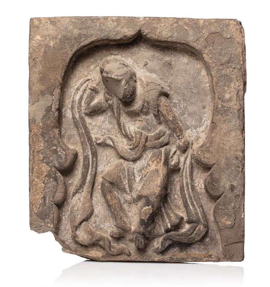 Elément d'architecture en terre cuite grise, représentant un serviteur dont il manque le visage.