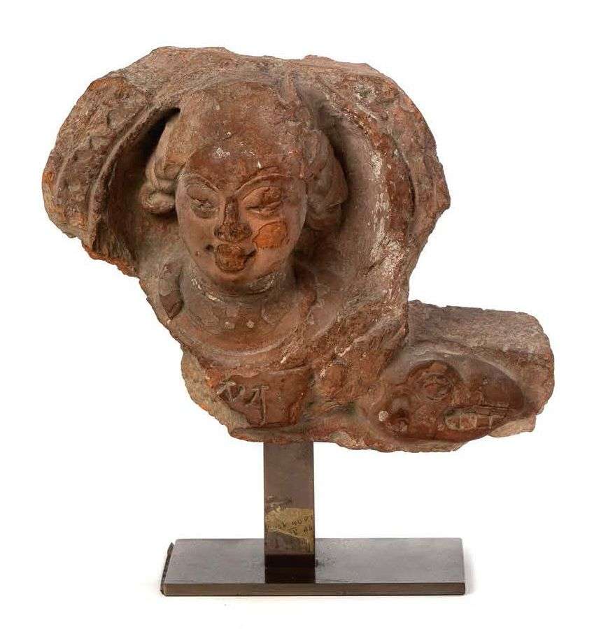 Buste en grès rosé, sculpté d'une tête féminine, une tête de serpent sur sa gauche, représentant probablement Shiva Nagaraja.