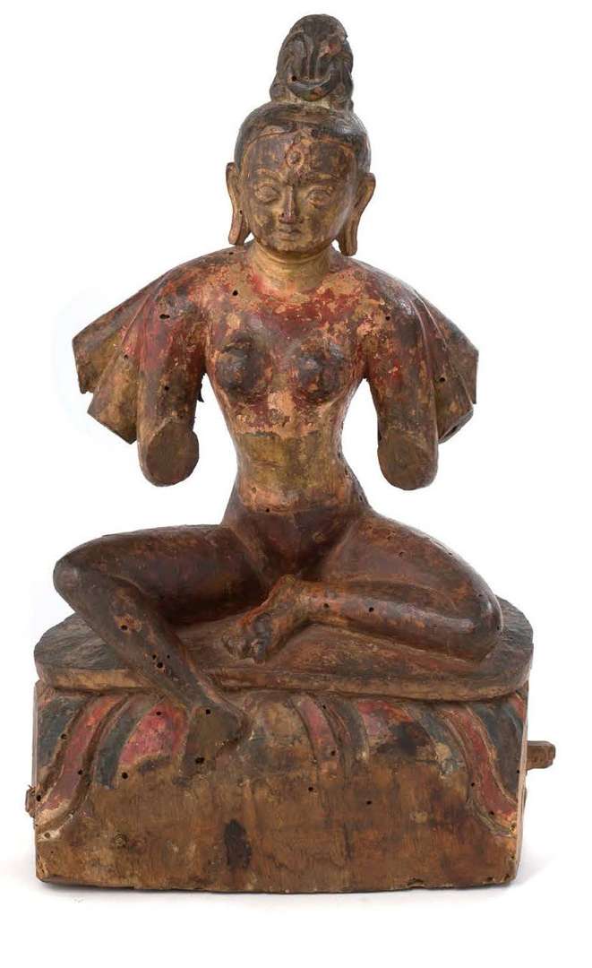 Tara verte en bois polychrome, assise en lalitasana sur un socle sculpté de pétales de lotus. La divinité porte le troisième oeil, et possède six bras.