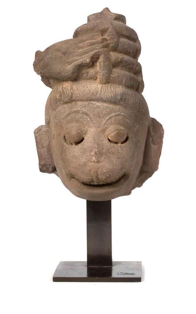 Sculpture en grès, représentant la tête d'Hanuman, surmontée d'un chignon, la main droite près du front.
