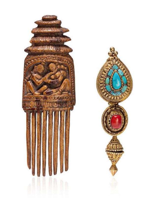 Lot comprenant un peigne en os à décor de personnages dans une pagode et une boucle en cuivre doré ornée de cabochons de turquoise et pierre dure rouge.