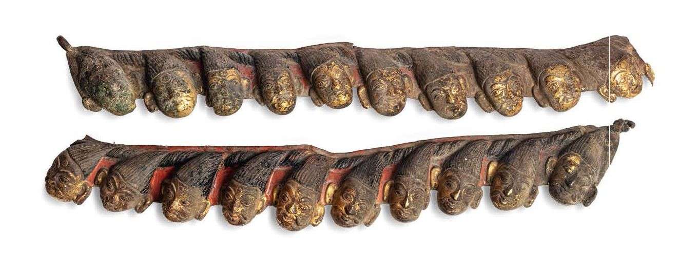 Deux éléments formant ceinture en cuivre repoussé anciennement doré et traces de laque rouge, représentant une guirlande de vingt têtes coupées, les cheveux tressés.