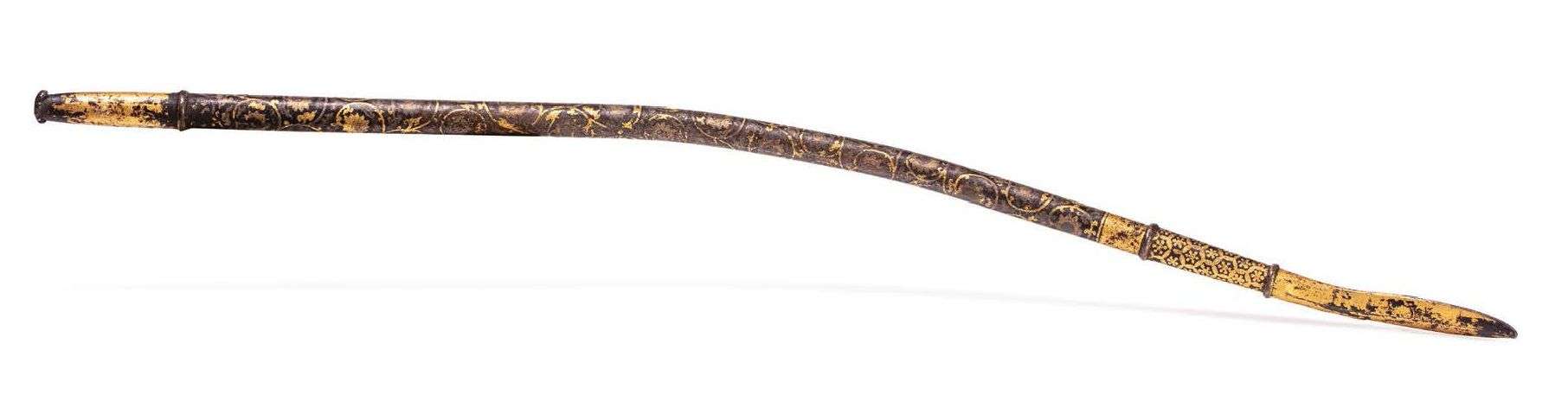 Longue tige en bronze damasquiné or et argent à décor de fleurettes et rinceaux feuillagés.