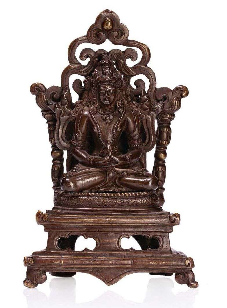 Petit sujet en bronze patine médaille, représentant une divinité féminine assise en méditation sur un trône au dossier ajouré, les mains en anjali tenant une pêche.