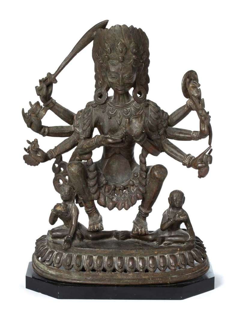Important groupe en bronze, représentant la divinité Chamunda à huit bras tenant un kartrika, un damaru, une tête, un glaive, kapala, trikula, et un disque. Elle se tient accroupie sur deux adorants, sur une base en forme de lotus. Elle est vêtue de têtes de citipati sur sa robe et coiffée d'une couronne.