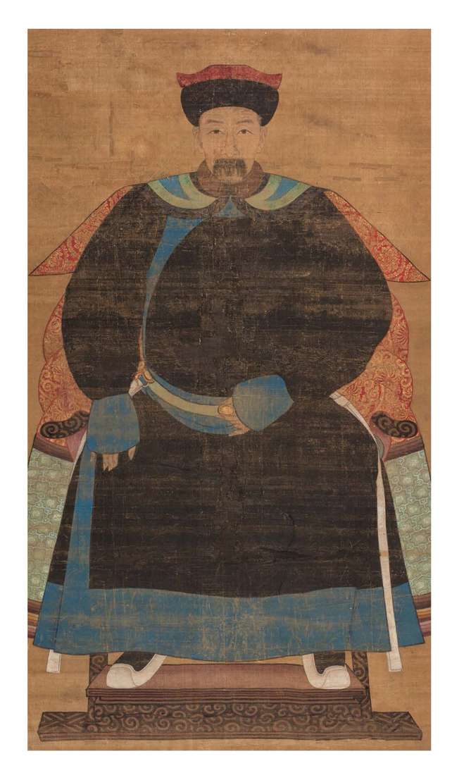 Peinture verticale à l'encre et couleurs sur soie, représentant un portrait d'un grand dignitaire mandchou en costume bleu et chapeau rouge, signature anonyme.