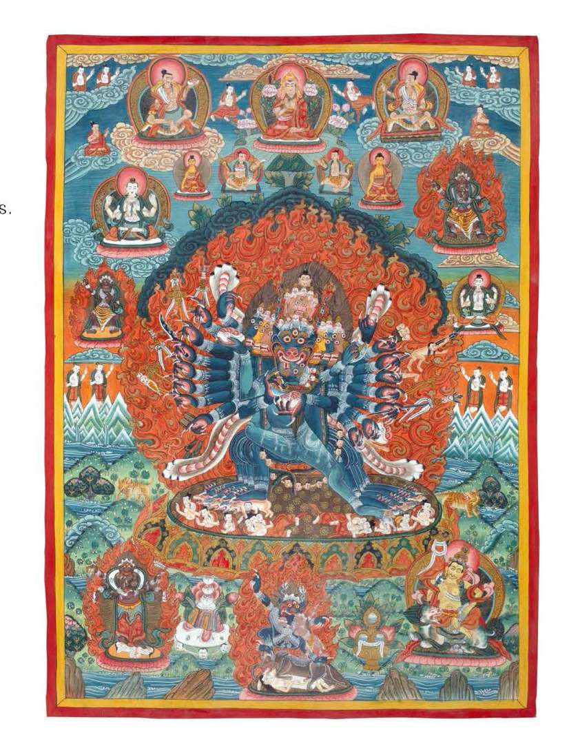 Thangka représentant Yamanthaka enlaçant sa shakti, entouré d'un mahakala, boddhisattva, et lama aux bonnets jaunes.