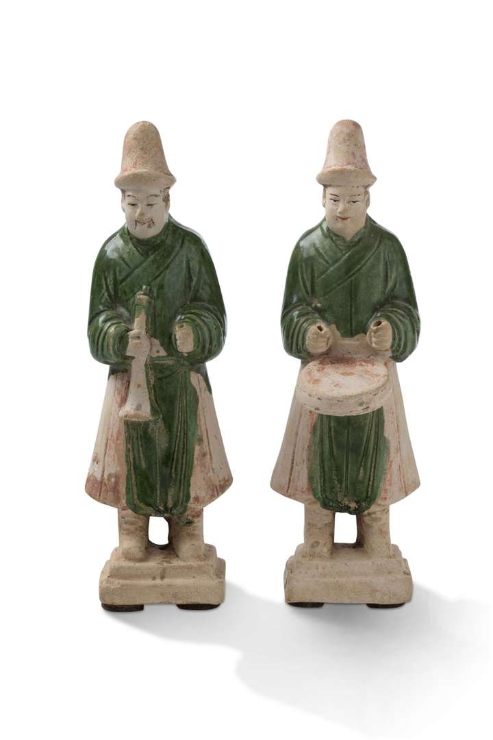 Deux statuettes Mingqi en terre cuite argileuse et fine, polychromes blanche et ocre, moulées, recouvertes en partie d'une glaçure verte, représentant chacune un musicien debout, les pieds fixés sur leur terrasse, drapés d'un long manteau dont la glaçure verte est inaboutie sur les côtés, et dotés d'un chapeau surélevé arrondi. L'un avec un tambourin, dont les mains présentent encore les ouvertures pour les baguettes. Le second tenant une trompette de sa main droite.
