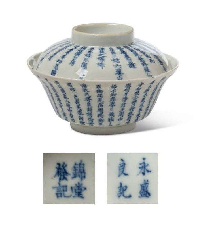 Coupe couverte en porcelaine bleu-blanc à décor de calligraphies.