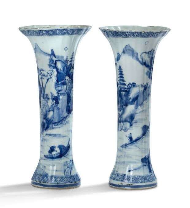 Lot comprenant une paire de vases cornets, à décor en bleu de paysages lacustres entourés de pics montagneux traversés par une rivière sur laquelle naviguent des embarcations | et cinq assiettes et une coupe creuse en émaux de la famille rose, bleu-blanc, et Imari chinois, à décor floral.