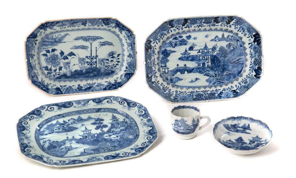 Ensemble de porcelaines bleu-blanc, à décor de pagodons, paysages lacustres, terrasses arborées, comprenant trois petits plats, une soucoupe et une tasse.
