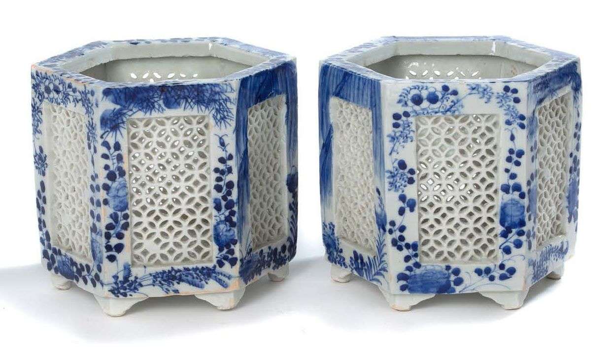 Paire de jardinières hexagonales ajourées en porcelaine bleu-blanc à décor de fleurettes et branches de pins.