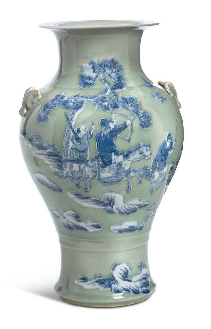 Vase balustre en porcelaine émaillée en bleu sur fond céladon, à décor en léger relief d'une scène de chasse à l'arc, deux papillons en relief formant anses.