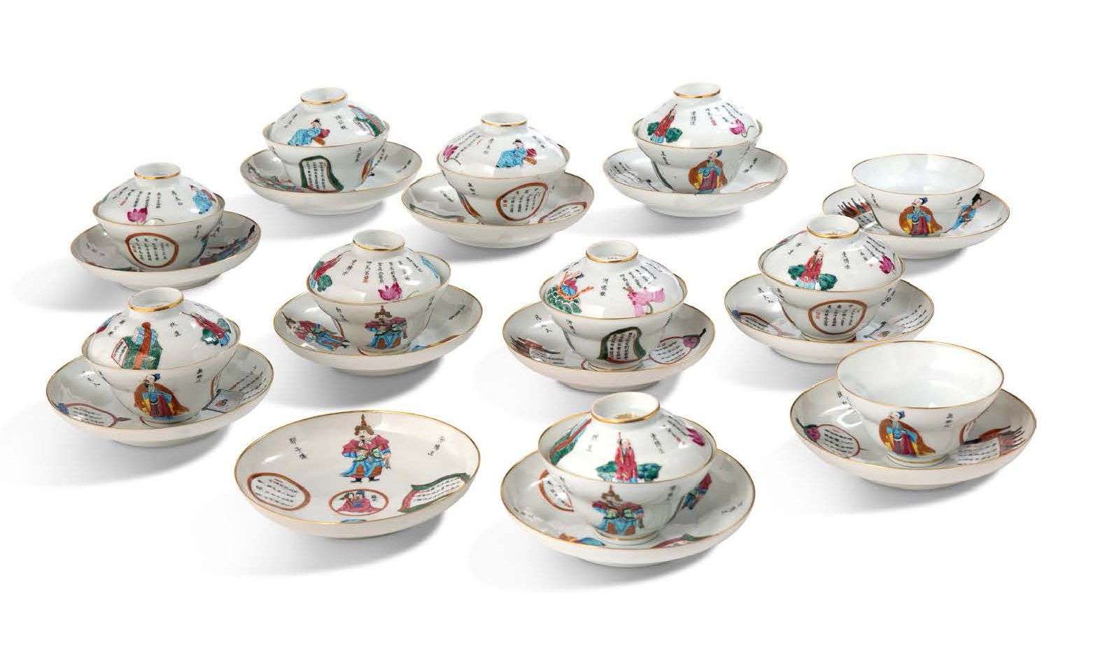 - 12 coupes en porcelaine et émaux polychromes à décor de style Wushangpu de personnages illustres avec leurs biographies.