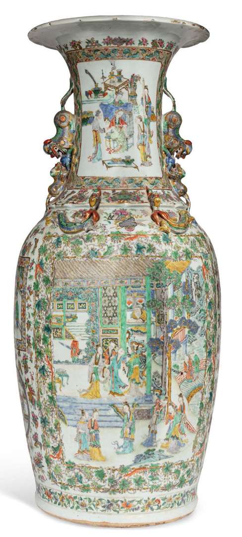 Important vase balustre en porcelaine et émaux de la famille rose, à décor en médaillons de scènes de palais animées de personnages dont cérémonie religieuse, réunion de lettrés, jeunes femmes lisant de la poésie, cérémonie des parfums, jeux d'enfants. L'autre partie à décor de papillons, jardinières, compositions florales et objets mobiliers. La base du col est ornée de dragons salamandres et lions bouddhiques en relief.