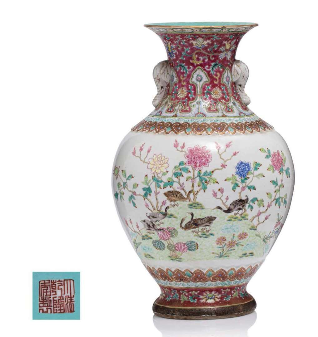 Vase de forme balustre orné de deux têtes d'éléphants, en porcelaine et émaux de la famille rose, finement décoré d'oies sauvages évoluant parmi des lotus et pivoines en fleurs. La base ornée de guirlandes de ruyi et lotus. Le base du col à motifs de ruyi.