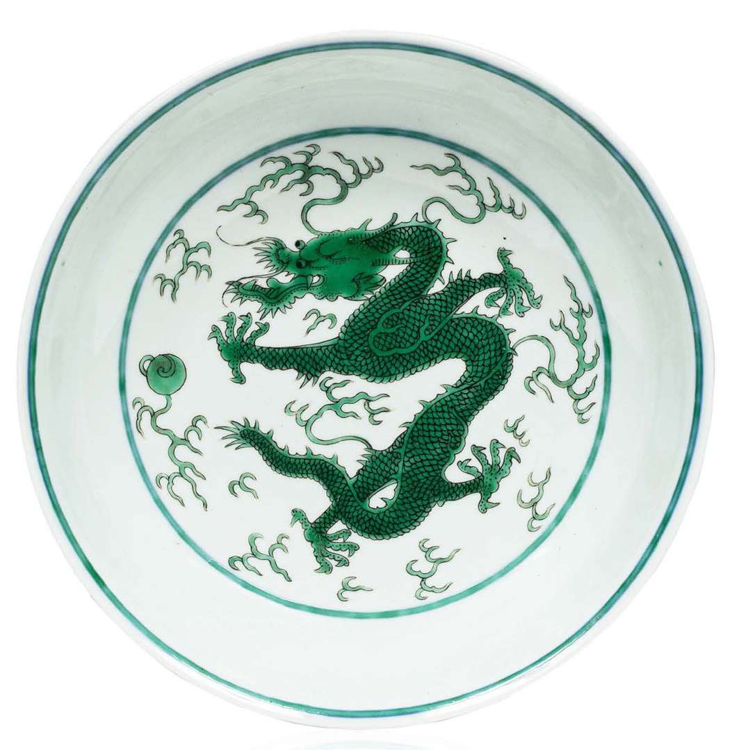 Coupe en porcelaine blanche, à décor en médaillon central d'un dragon à cinq griffes émaillé en vert poursuivant la perle sacrée parmi des nuages. Le revers également orné de deux dragons déployés poursuivant la perle sacrée. Marque Qianlong en zhuanshu et d'époque.