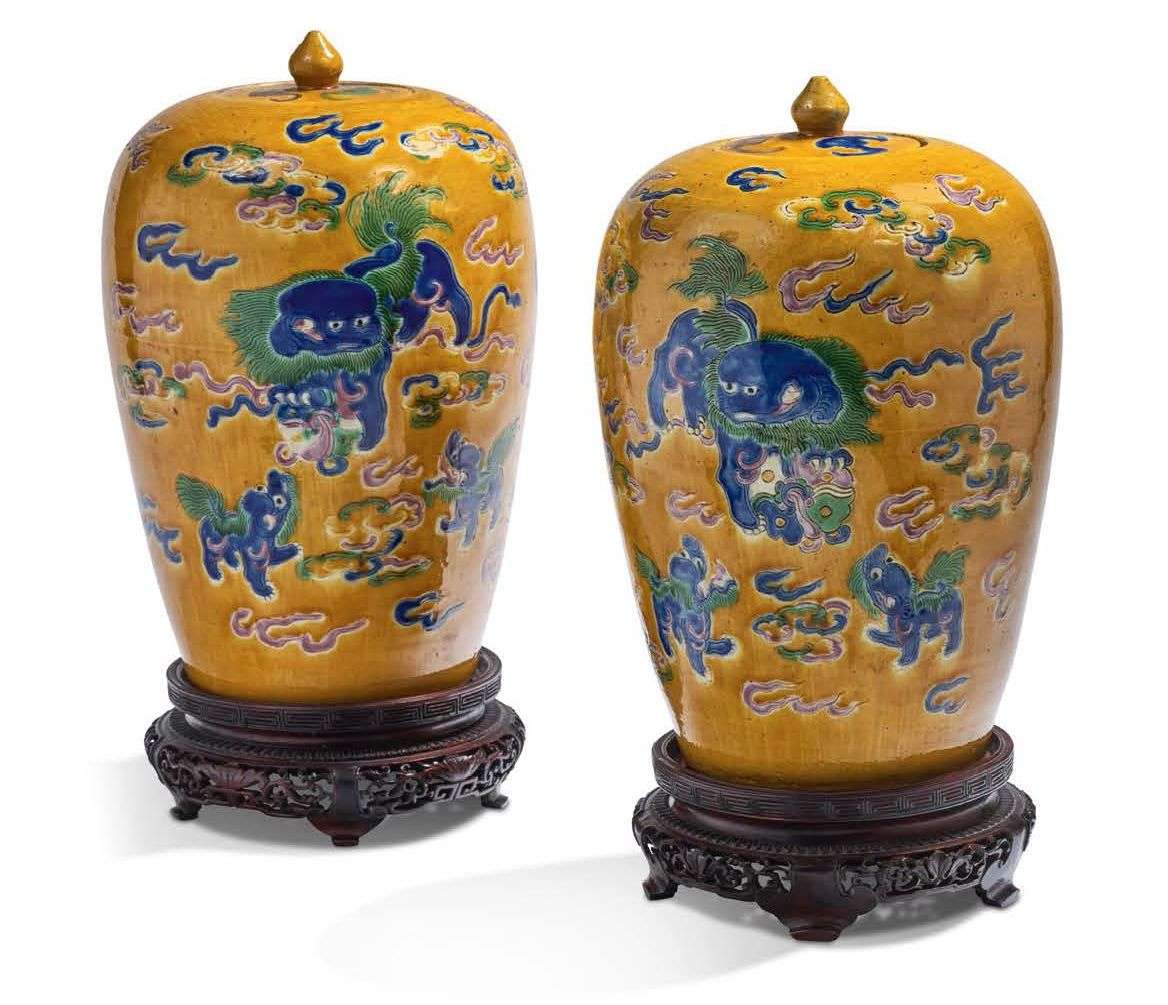 Paire de potiches ovoïdes couvertes en porcelaine, à décor émaillé polychrome sur fond jaune de lions bouddhiques tenant le joyau sacré parmi des nuages stylisés.