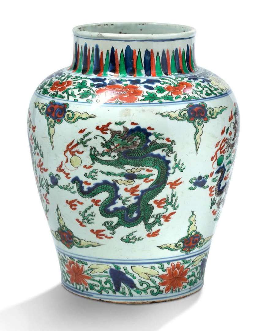 Potiche balustre en porcelaine et émaux Wucai, à décor de quatre dragons lovés parmi des flammes, poursuivant la perle sacrée. Fleurs de pivoines et lotus en deux bandes concentriques complètent le décor.
