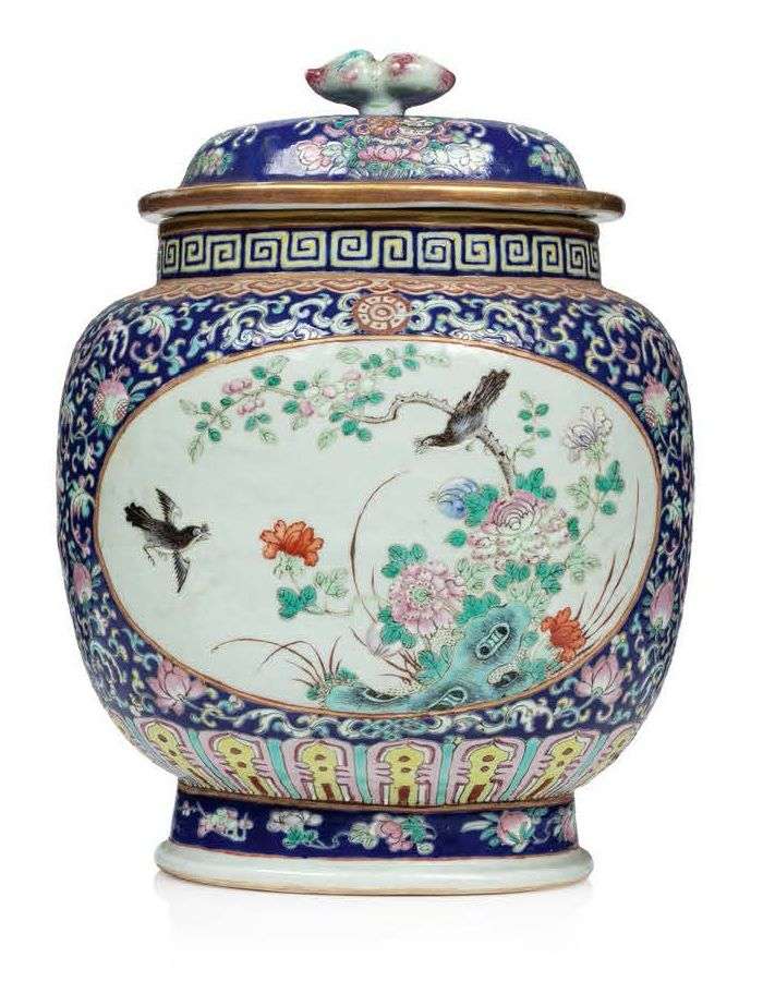 ° Vase couvert en porcelaine et émaux polychromes, à décor fleuri d'oiseaux et frises de grecques sur le col et de pêches sur le pied. La prise en forme de pêches.