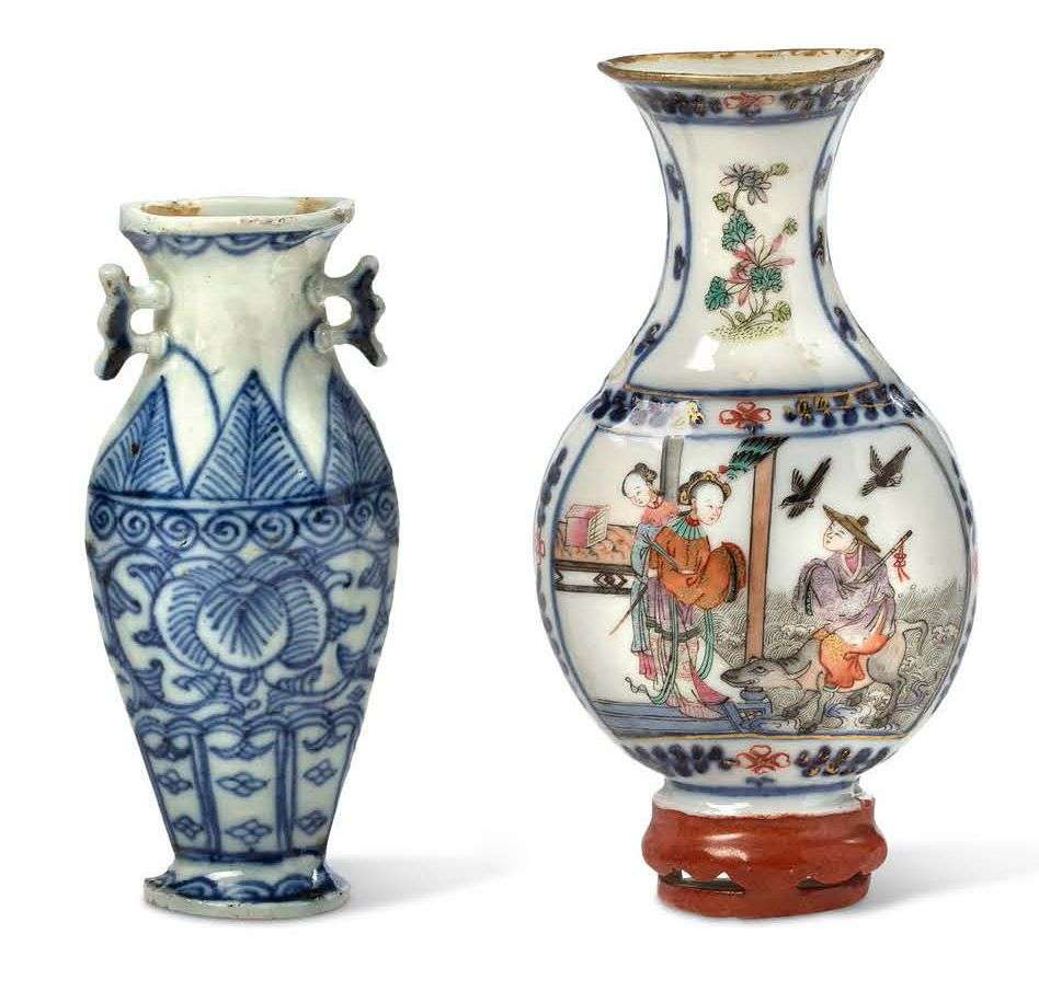 Vase d'applique en porcelaine et émaux de la famille rose, à décor d'un jeune homme sur un buffle rendant visite à des jeunes femmes, sur des flots écumants, aux abords d'un palais.