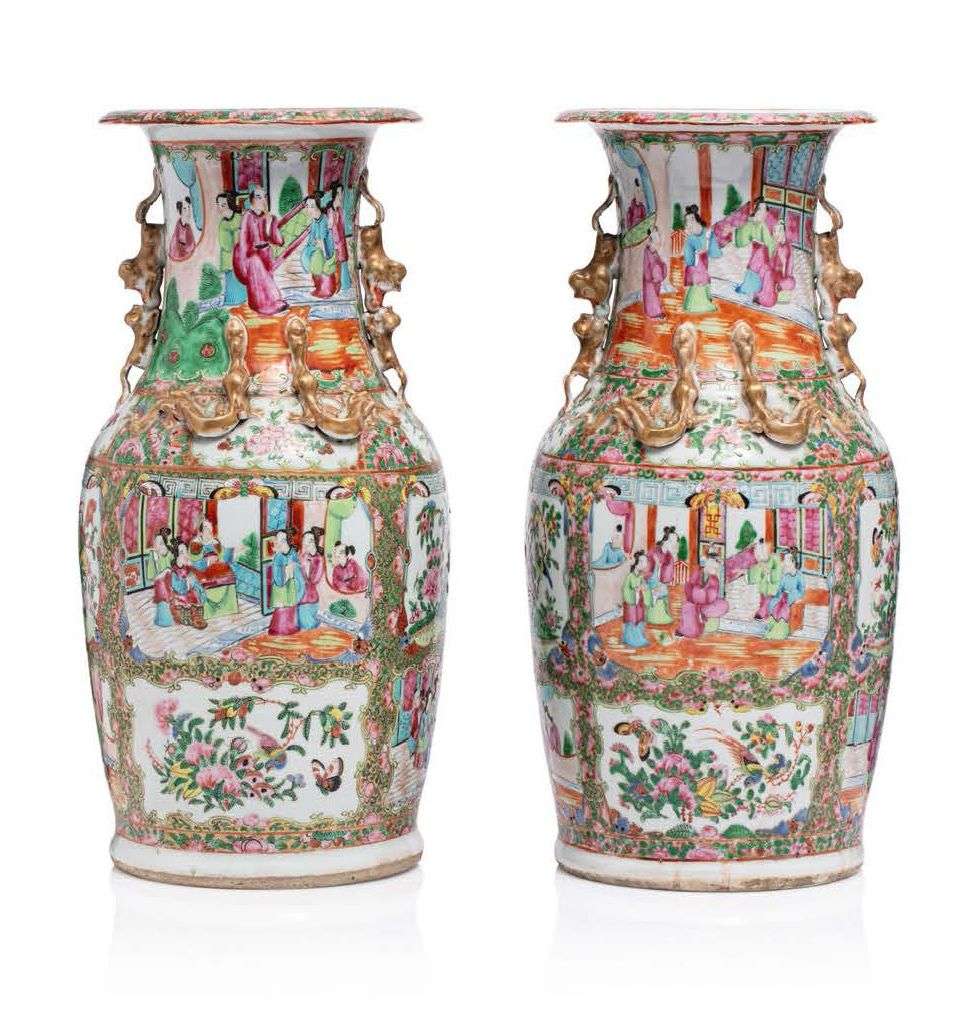 Paire de vases balustres en porcelaine et émaux de la famille rose, à décor en médaillons de scènes animées de personnages, oiseaux et compositions florales, dragons salamandres et lions bouddhiques en relief ornent le col.