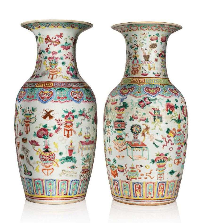 Paire de vases balustres en porcelaine et émaux de la famille rose, à décor d'objets mobiliers et compositions florales.