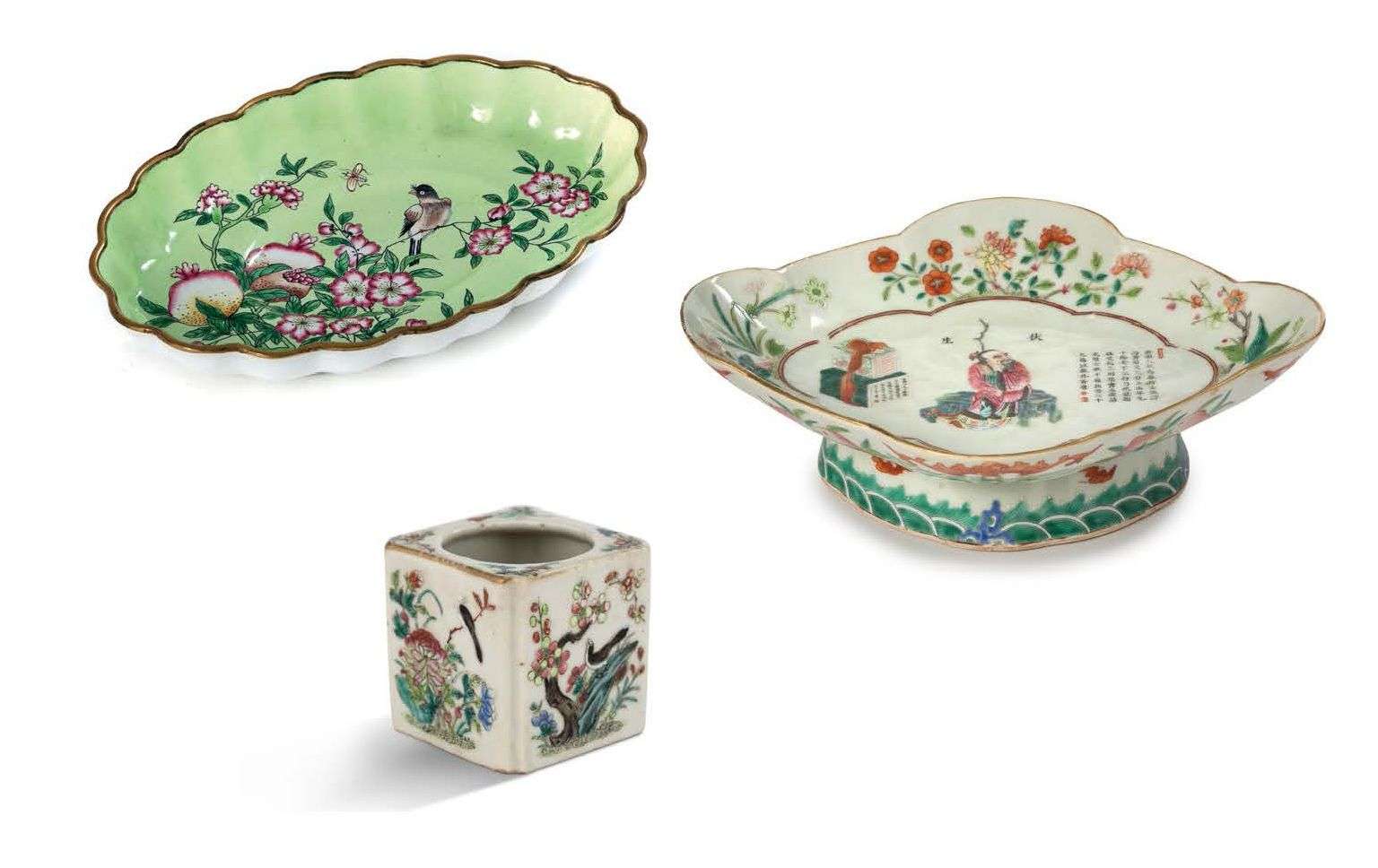 Petit ensemble comprenant une coupe en émaux à décor de grenades et oiseaux, et un encrier en porcelaine à décor de fleurs et oiseaux.