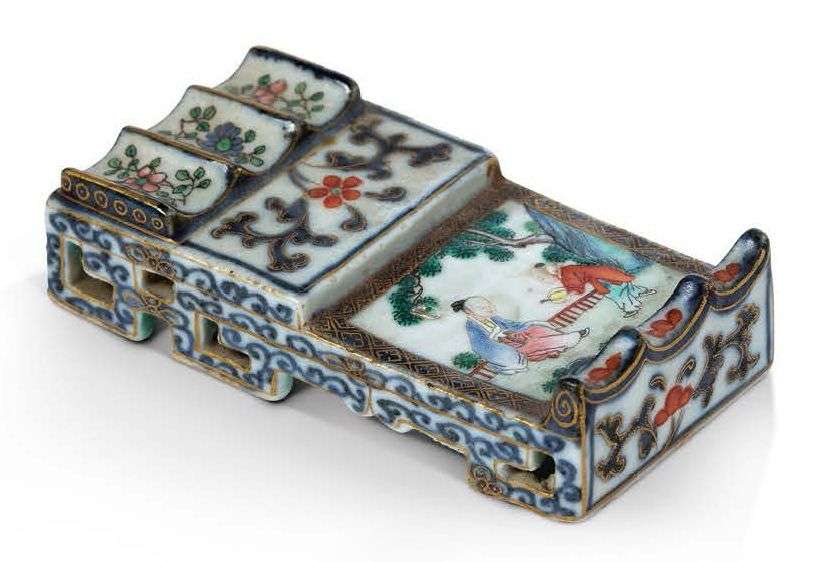 Repose-pinceaux en porcelaine et émaux de la famille rose à décor d'une jeune femme et son enfant sur une terrasse, bordure en bleu sous couverte de rinceaux. Marque Jiaging sur la base.