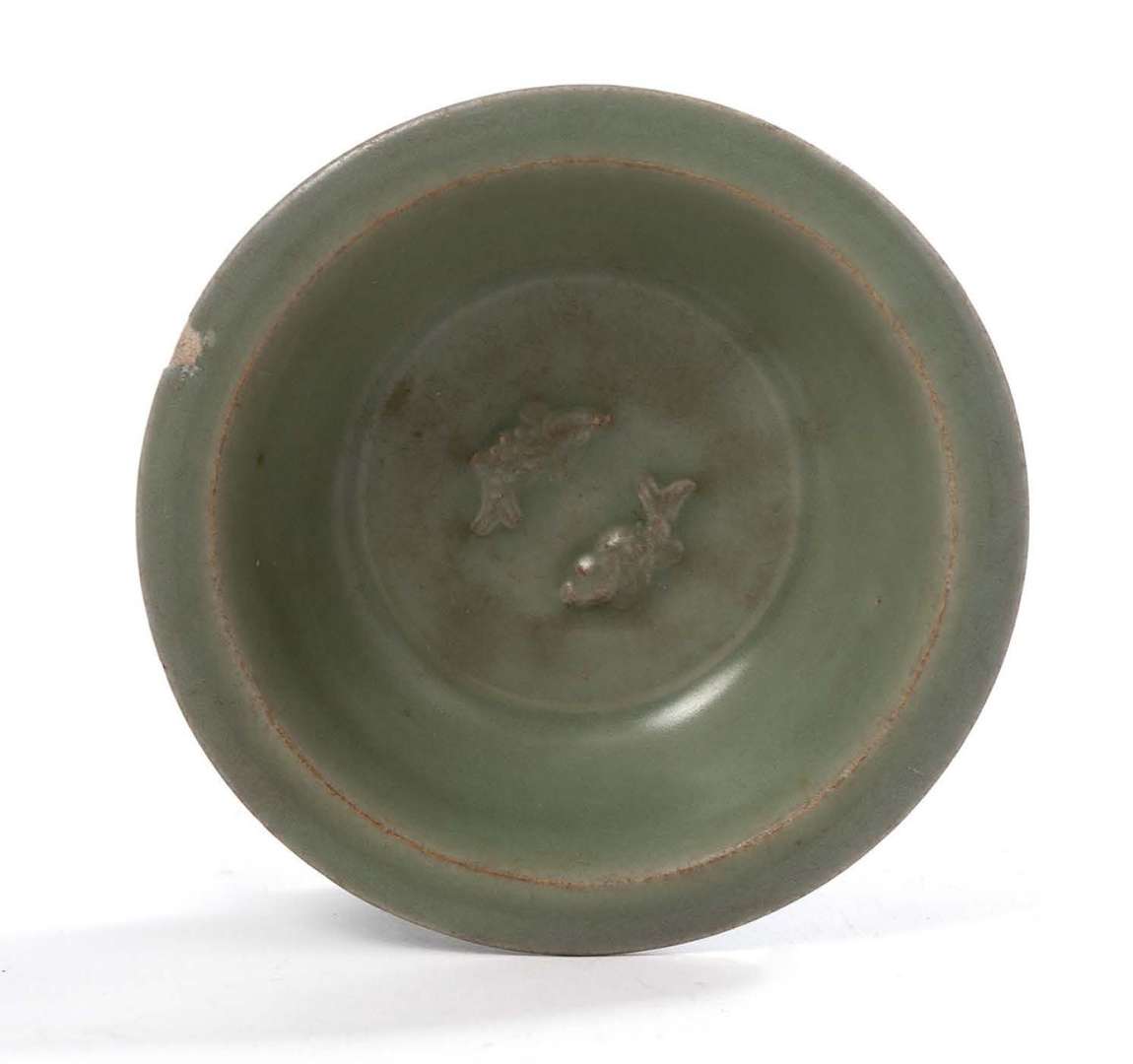 Coupe en grès émaillé vert céladon à bordure évasée, deux poissons en léger relief ornent le centre, le pourtour à décor en léger relief d'une frise de feuilles.