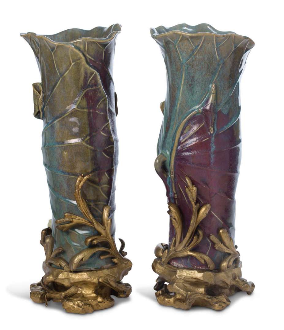 Paire de vases en porcelaine émaillée bleu lavande et sang de boeuf reposant sur un fond céladon reprenant la forme de feuilles de lotus enroulées, sur leur socle en bronze rocaille.