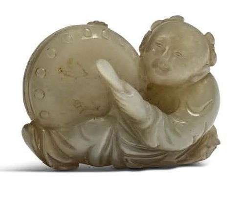 Pendentif en jade céladon représentant un enfant jouant du tambourin.