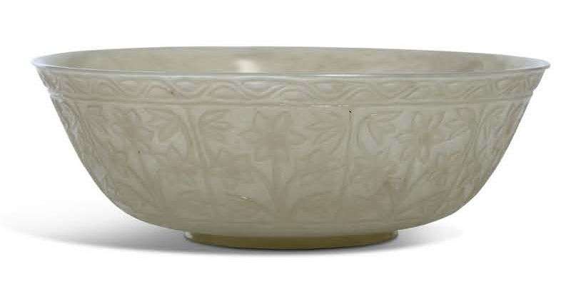 Coupe à offrandes en jade, à décor extérieur en relief de compositions florales et guirlandes de vagues ondulantes.