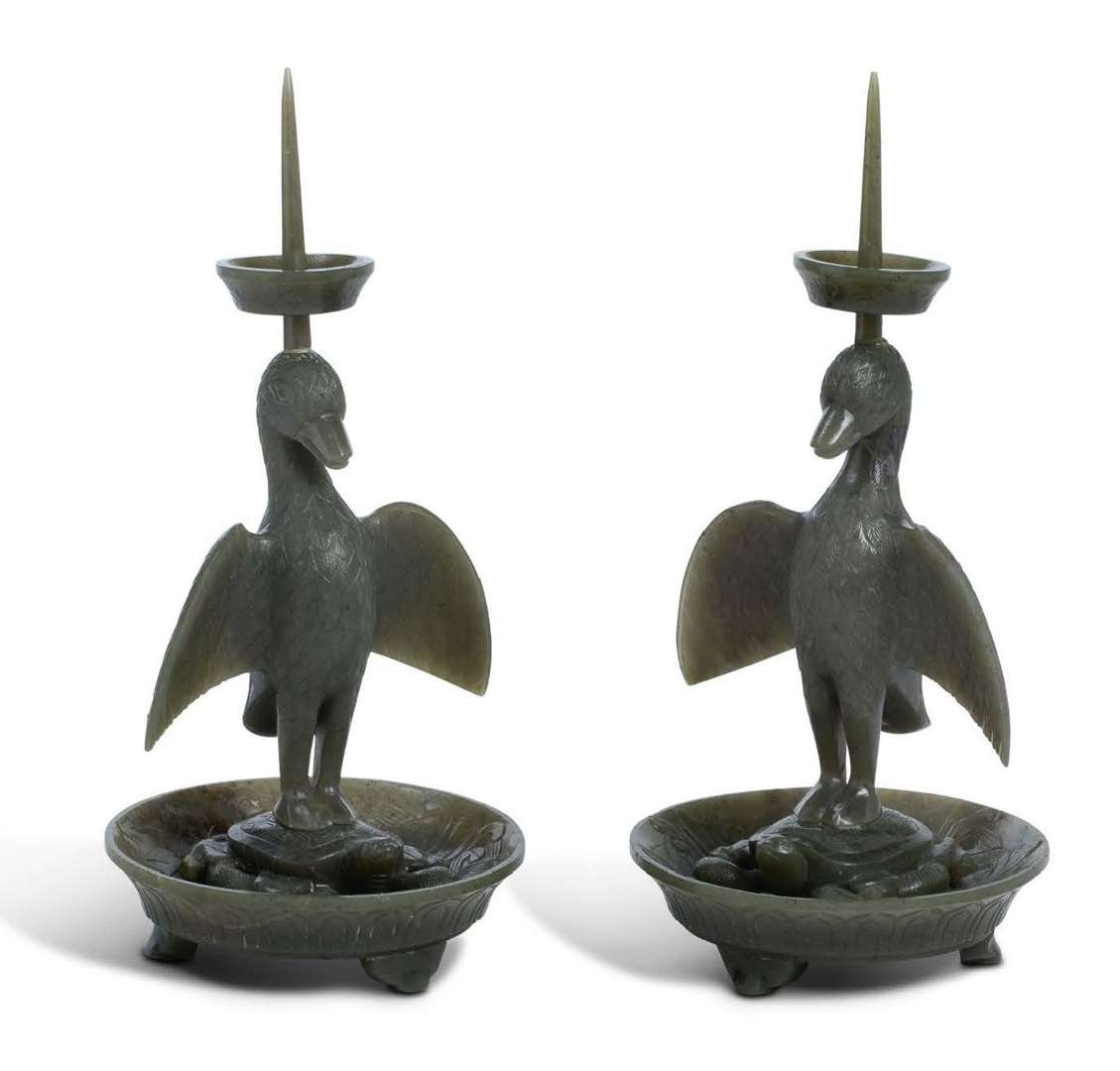 Paire de pique-cierges en jade vert épinard, représentant des canards perchés sur des tortues, évoluant sur un fond de flots écumants et de rochers sur une coupe tripode.