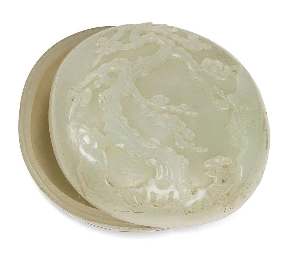 Couvercle en jade blanc céladonné, à décor de prunus en fleurs, rapporté sur une base en jade céladon à décor de pétales de lotus.