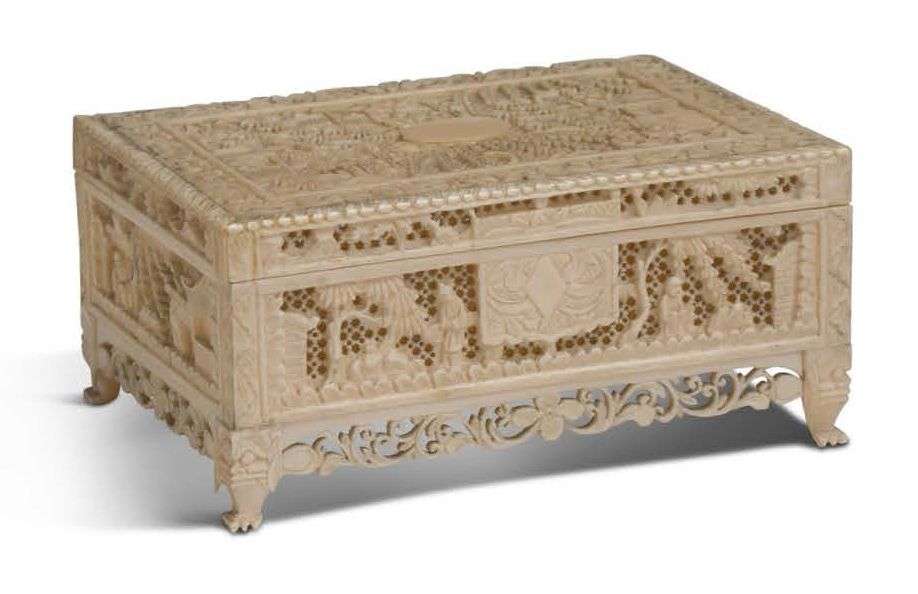 Boite rectangulaire en ivoire ajouré, à décor de scènes de personnages parmi des pavillons et saules pleureurs. Reposant sur quatre pieds griffés surmontés de têtes zoomoprhes.