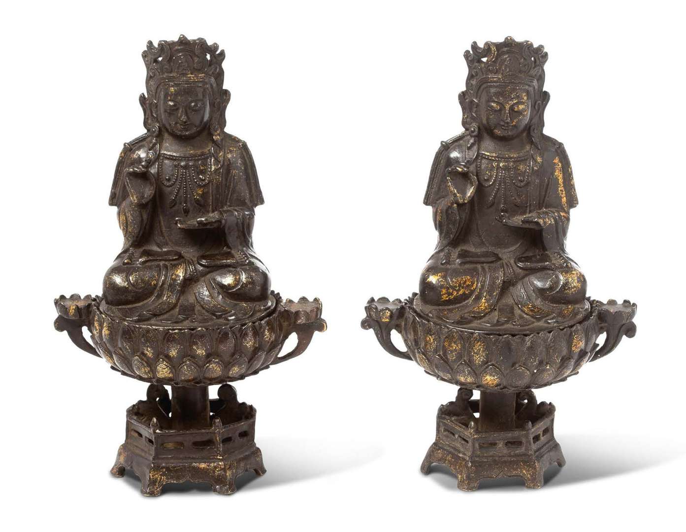 Paire de Bouddhas en alliage de bronze et métal sur leur socle lotiforme.