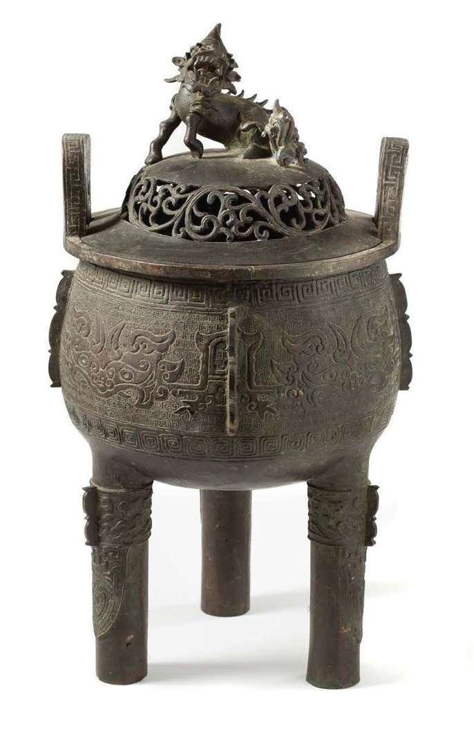Ding en bronze à décor en relief de quatre masques de taotie et frises de grecques stylisées ainsi que sur les deux anses.