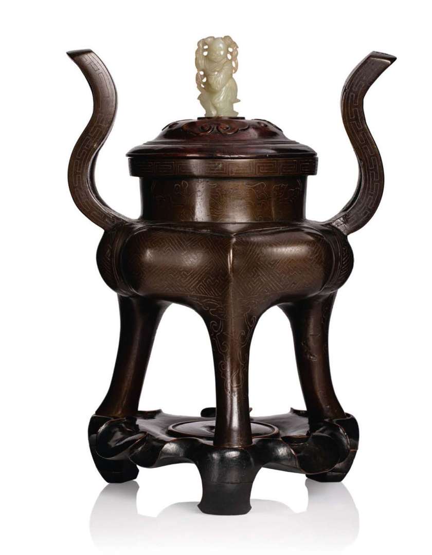 Brûle-parfum lotiforme tripode en bronze, orné de deux anses galbées. Des motifs de fleurs de lotus et grecques niellés d'argent reposant sur un fond brun clair. Couvercle en bois avec prise en jade représentant un enfant.