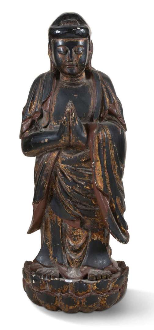 Bouddha en bois debout les mains jointes sur son lotus. anciennement laqué or.
