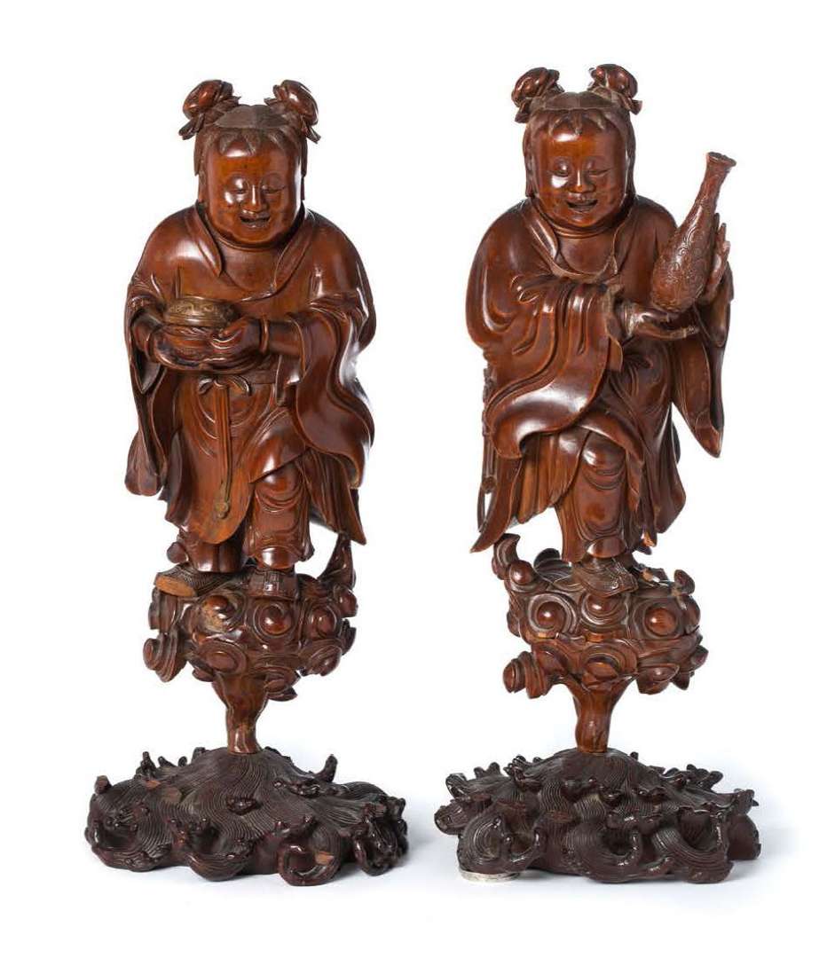 Ensemble de deux statuettes en buis, finement sculptées et représentant les frères Hoho présentant des offrandes, l'un tenant la coupe à offrandes ornée d'une chauve-souris, l'autre tenant le vase à eaux lustrales. Chacun se tenant debout sur des socles sculptés en forme de nuages au-dessus de vagues écumantes.